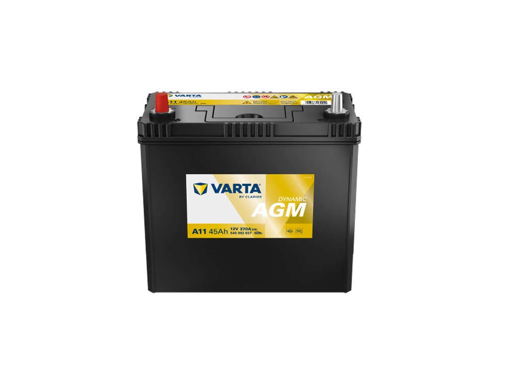 Autobaterie VARTA Dynamic AGM A11, kapacita 45Ah,napětí 12V, startovací proud 370A, plus vlevo, úzké kontakty. 545902037. Vhodné pro moderní vozidla se start-stop systémem.