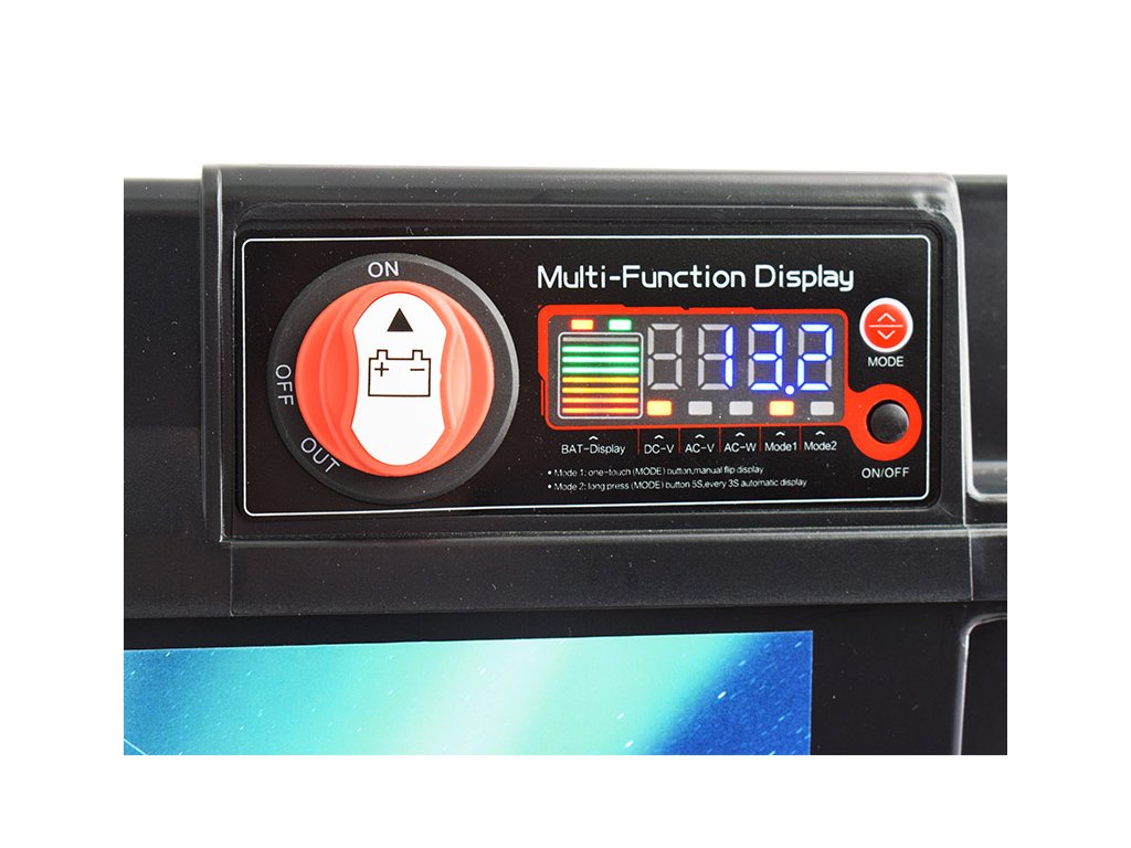- LED informanční displej signalizuje stav baterie, dodávaný výkon měniče, napětí AC a DC