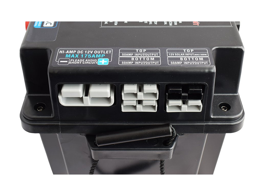 Zabudované vstupně/výstupní konektory pro připojení 12 V spotřebičů (3 x 50A konektory a 1x 175A konektor).