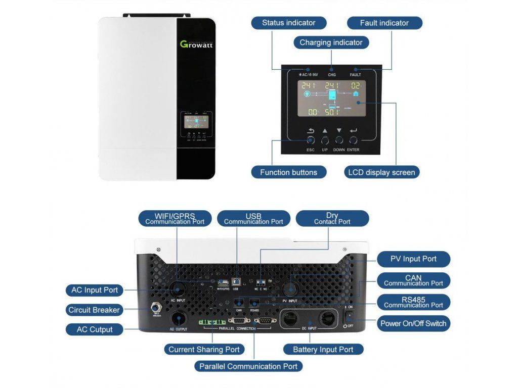 Měnič Growatt SPF 3500 ES je optimální volbou pro tzv. ostrovní systémy bez dostupné distribuční sítě – k jednotce může být připojena elektrocentrála a/nebo baterie, jako záložní zdroj energie. Jedná se o hybridní měnič se sinusovým výstupem ideální pro domácí a malé komerční systémy. Vestavěný MPPT regulátor zvládne až 4,5 kW FV pole s maximálním napětím na prázdno 450Voc. Umí pracovat jak s olověnými tak i Li-ion akumulátory. Samozřejmostí jsou porty RJ45 pro CAN/RS485 komunikaci s BMS modulových akumulátorů LiFePO4 značek např. Pylontech, WECO, Seplos atd..