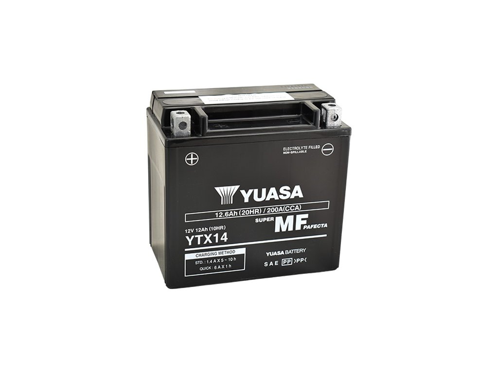 Motobaterie YUASA YTX14, napětí 12V, kapacita 12Ah, startovací proud 200A, zprovozněno výrobcem.