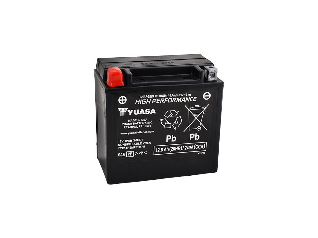 Motobaterie YUASA YTX14H, napětí 12V, kapacita 12Ah, startovací proud 240A, zprovozněno výrobcem.