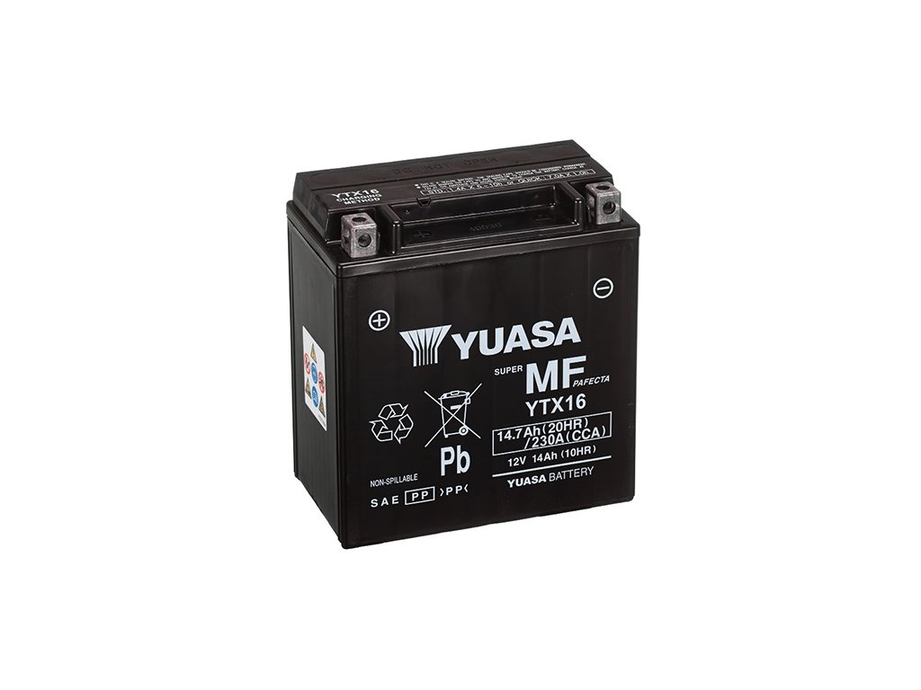 Motobaterie YUASA YTX16, napětí 12V, kapacita 14Ah, startovací proud 230A, zprovozněno výrobcem.