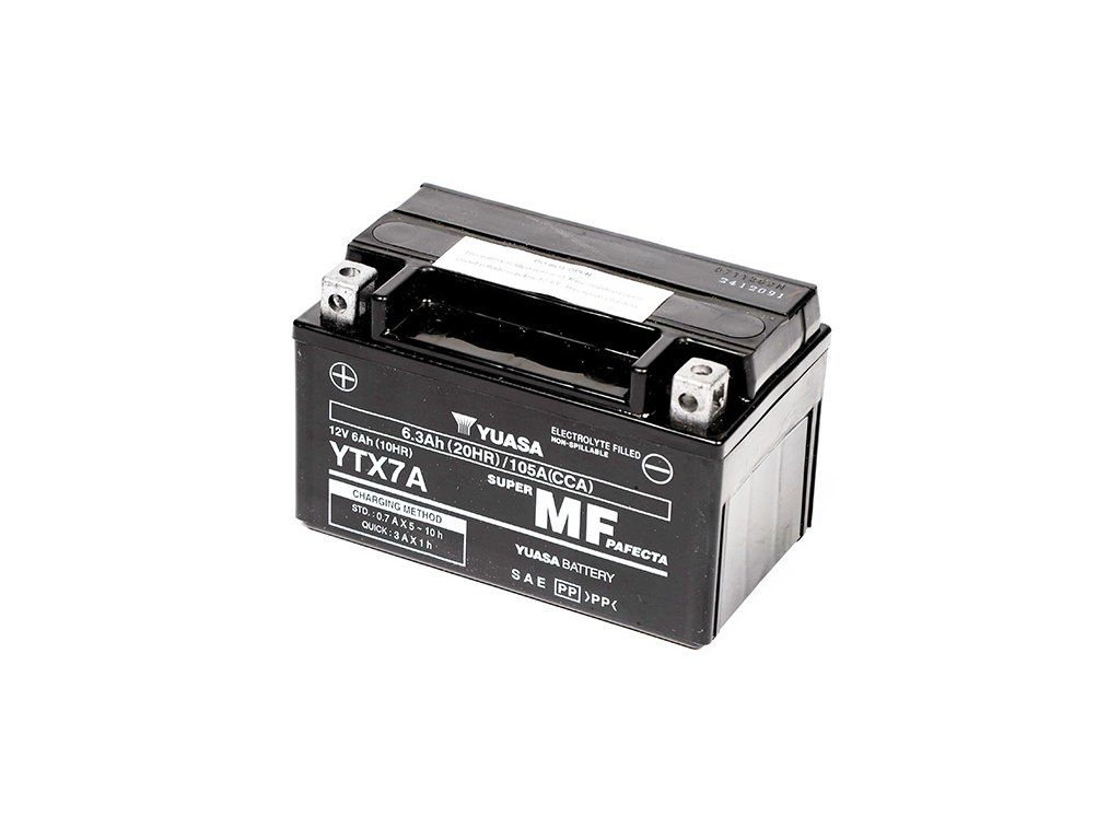 Motobaterie YUASA YTX7A, napětí 12V, kapacita 6Ah, startovací proud 105A, zprovozněno výrobcem.