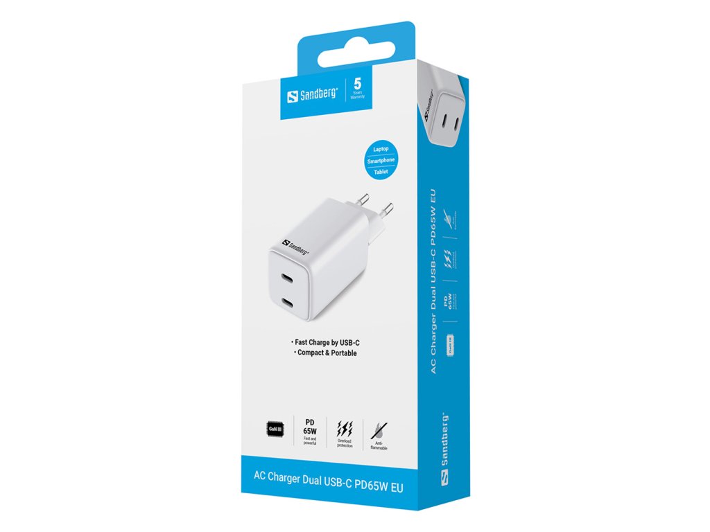 Kompaktní nabíječka se dvěma bleskově rychlými porty USB-C pro nabíjení vašich zařízení. Můžete zvolit použití jednoho portu při plném výkonu 65 W, což bude stačit pro nabití většiny notebooků s konektorem USB-C. Nebo můžete použít oba porty současně, což znamená, že výkon bude rozdělen a lze jej využít například pro současné nabíjení chytrého telefonu a tabletu či netbooku.